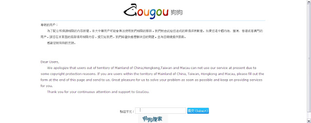 最近用迅雷的搜索资源,往往打开狗狗搜索就显示”尊敬的用戶:    為了配合和保護相關的內容版權,非大中華用戶可能會無法使用我們相關的服務,我們對由此給您造成的麻煩深表歉意。如果您是中國內地、臺灣、香港或者澳門的用戶,請您在本頁面的底部填寫相關內容,提交給我們,我們將儘快處理解決您的問題,並為您繼續提供服務。     感謝您對狗狗的支持。”如下图: